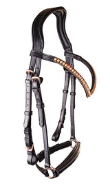 Eksklusiv sort lædertrense med elegant udsmykket v-formet pandebånd med Rosegold sten, Rosegold spænder og sort foret super blødt drop næsebånd til islandske heste.