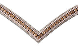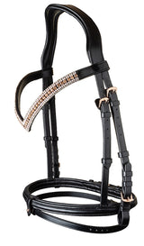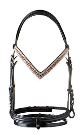 Eksklusivt flot sort lædertrense med elegant udsmykket v-shapet pandebånd med Rosegold sten, Rosegold spænder og med sort foret super blødt kombineret næsebånd til islandske heste.