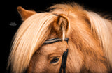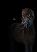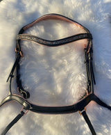 Flot sort lædertrense med elegant udsmykket U-shapet pandebånd med Rosegold sten, Rosegold spænder og med rosegold farvet foret blødt anatomisk næsebånd til islandske heste.