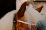 Flot stil rent Equitec pandebånd med 1 række store hvide krystaller og 2 rækker farvede små perler, der passer til alle trenser i Comfort Lux serien.